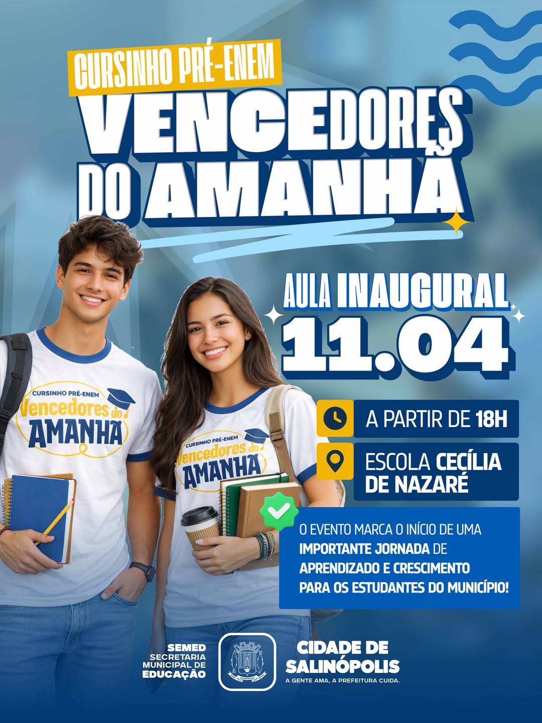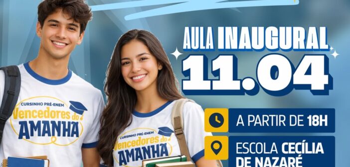 A Prefeitura de Salinópolis convida você para a aula inaugural do cursinho Vencedores do Amanhã, que acontecerá no dia 11 de abril, às 18h, na Escola Cecília de Nazaré.