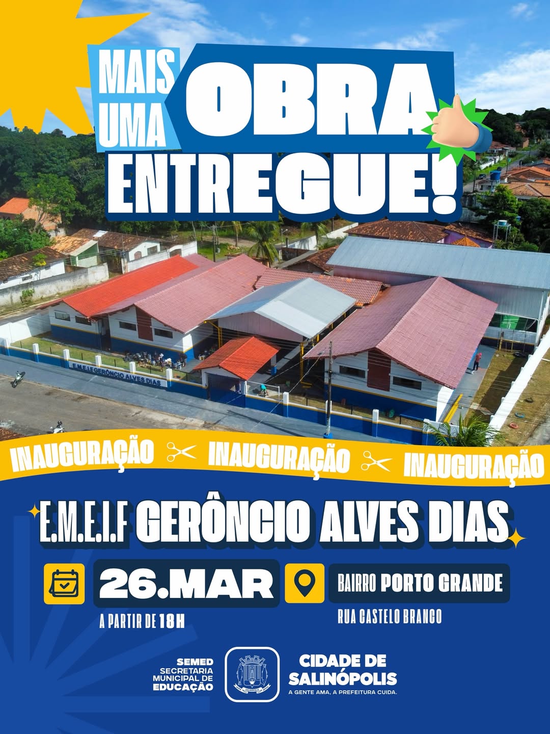 A inauguração da nova escola Gerôncio Alves Dias, no Porto Grande, é uma grande conquista para a comunidade. A Prefeitura convida todos para o evento dia 26 de março, às 18h!