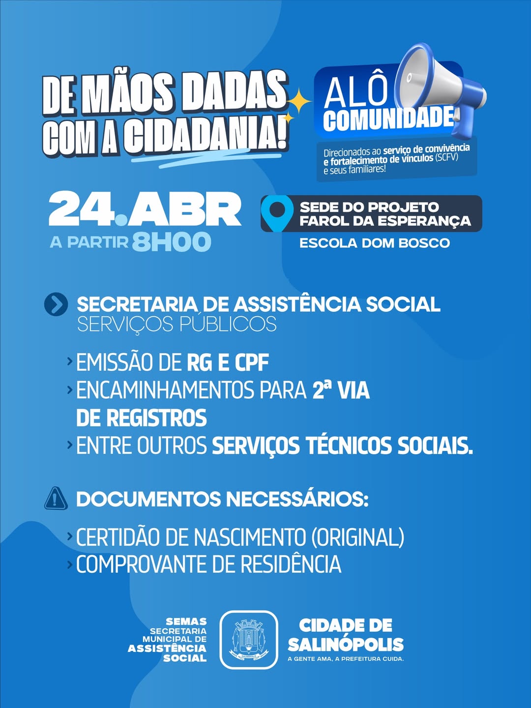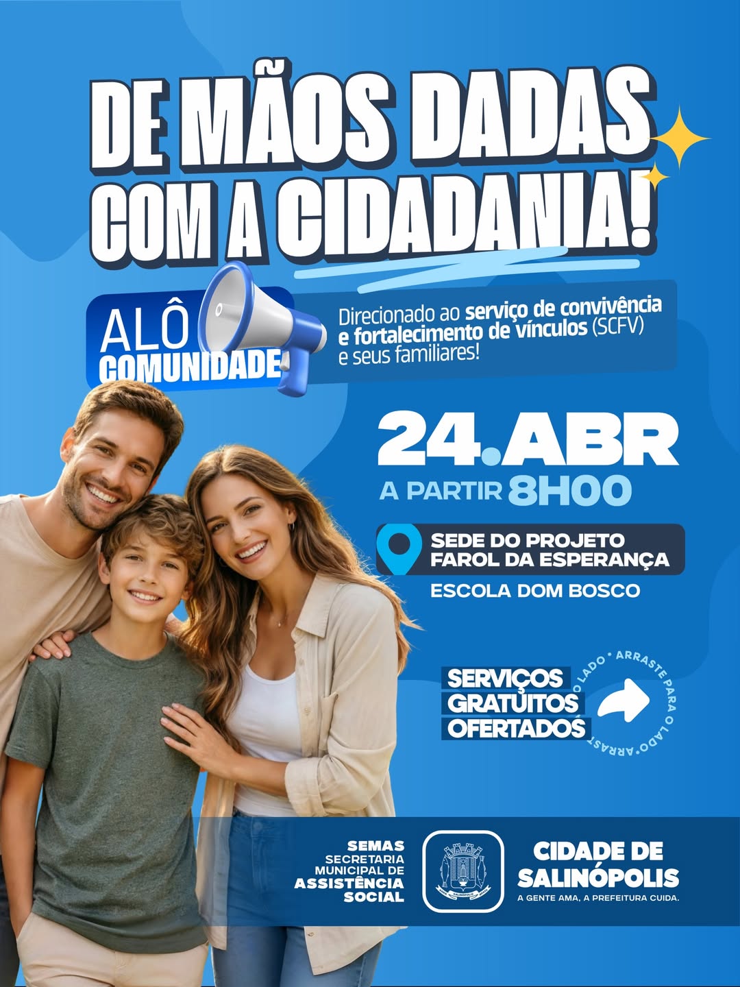 No dia 24 de abril, a Prefeitura de Salinópolis, através da Secretaria de Assistência Social estará realizando a ação Alô Comunidade direcionada ao Serviço de Convivência e Fortalecimento de Vínculos (SCFV) e seus familiares, com diversos serviços totalmente gratuitos.