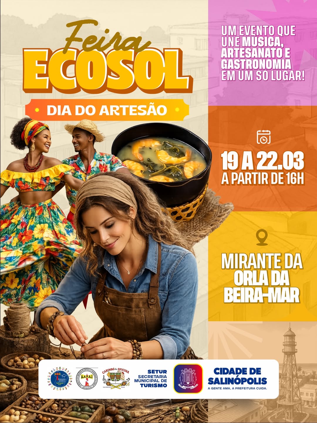A Feira ECOSOL está chegando em Salinópolis! De 19 a 22 de março, a partir das 16h, o Mirante da Orla da Beira-Mar será o palco de apresentações musicais, artesanato e gastronomia, em homenagem ao Dia do Artesão.