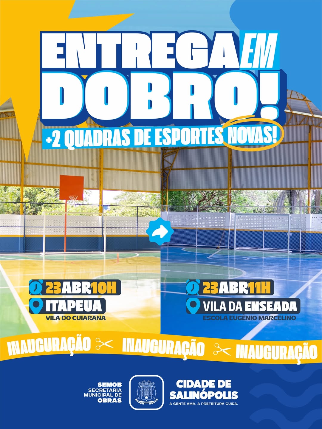 Nesta quinta-feira, dia 23, a Prefeitura de Salinópolis estará inaugurando duas quadras de esportes no município, levando mais lazer, saúde e qualidade de vida para as comunidades.